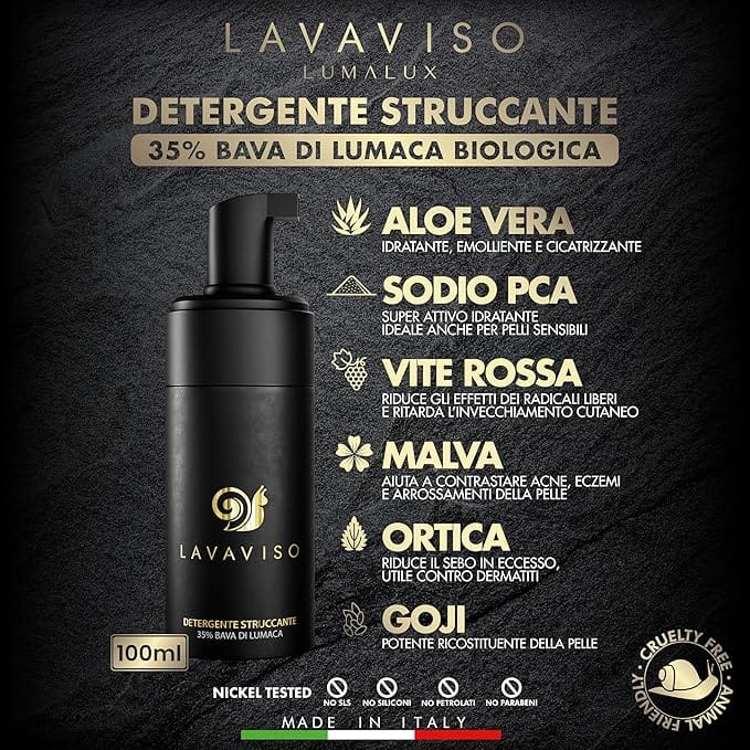 Lavaviso Detergente Struccante: unica mousse detergente viso sul mercato ad avere la bava di lumaca come primo ingrediente dell’INCI, ideale per la cura quotidiana del tuo viso. Detergente viso pelle grassa, detergente viso pelle secca.